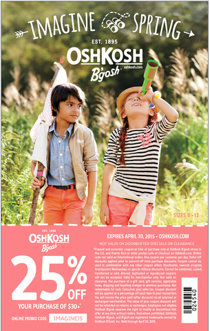 Use this printable coupon to save 25% off of your order of $30 or more instore! You can find a store near you with OshKosh store locator.