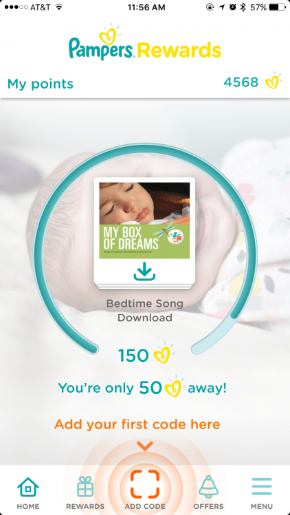To scan a code, just click on the orange square at the bottom of the screen, and you will be able to scan in your code…code…(of course you need to give the app permission to use your camera when prompted). You can also just type in the code if you wish. When you add your “first code” in the New Pampers Rewards App (even if you are an existing Pampers Rewards Member) you will get a 50 point bonus!