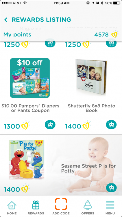 Last and my favorite part… you can enjoy shopping the rewards a lot easier! You can see your point total at the top while you look at the rewards that are available. I love that there are rewards for $10 off coupons! Snag those as often as you can…or the FREE boxes of diapers!