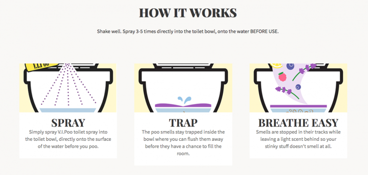 This is how V.I.Poo works! You simply spray it into the toilet BEFORE you go. The (nice) smell traps the bad! It’s not overpowering and too much either! I tried it personally and it worked great…yes I’m three shades of red typing this, lol!