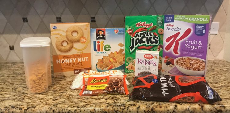 After a run to Kroger (where cereal is part of the Buy 5, save $5 right now) I came up with this fun mix for him. I think he will love it!