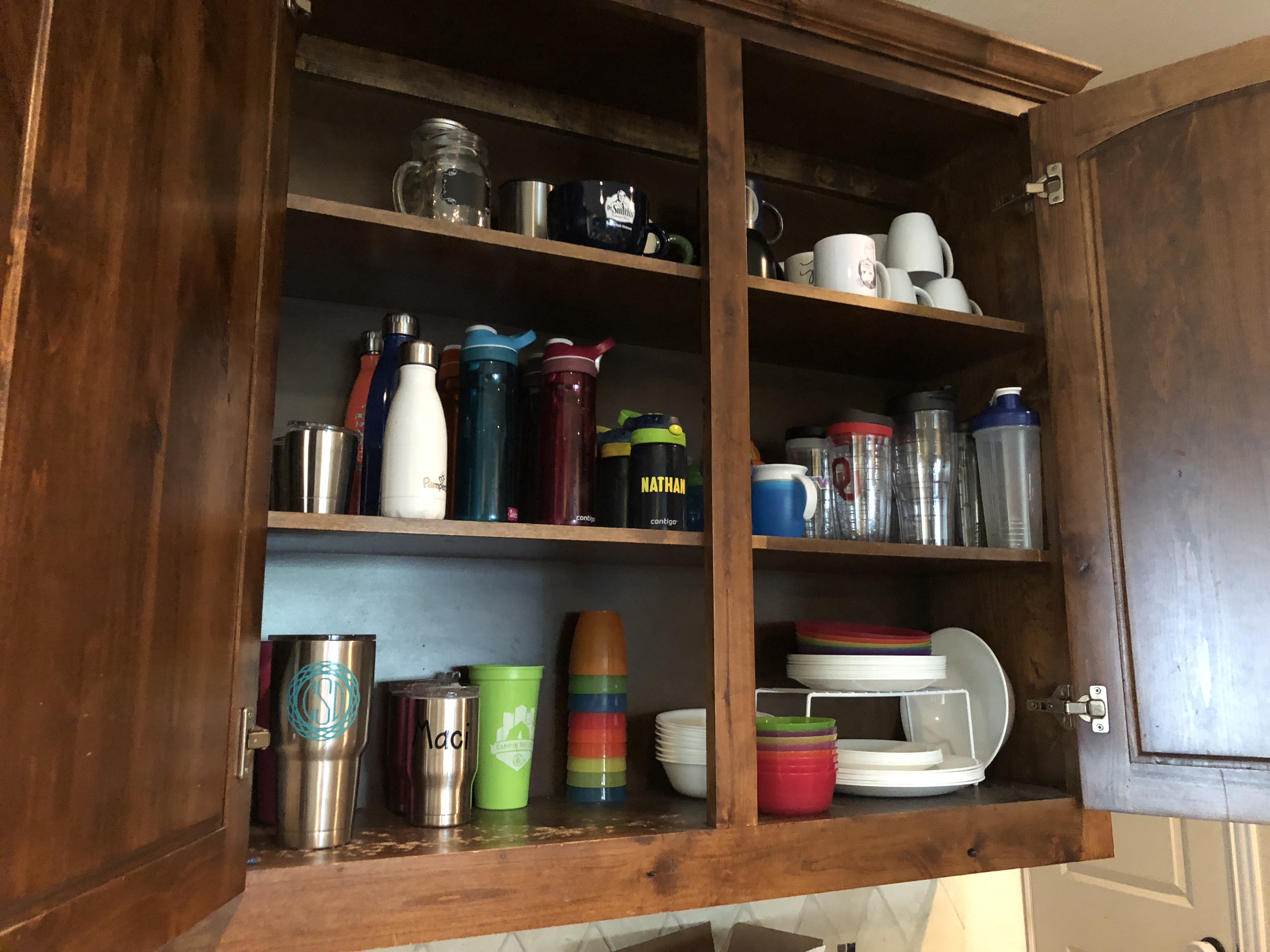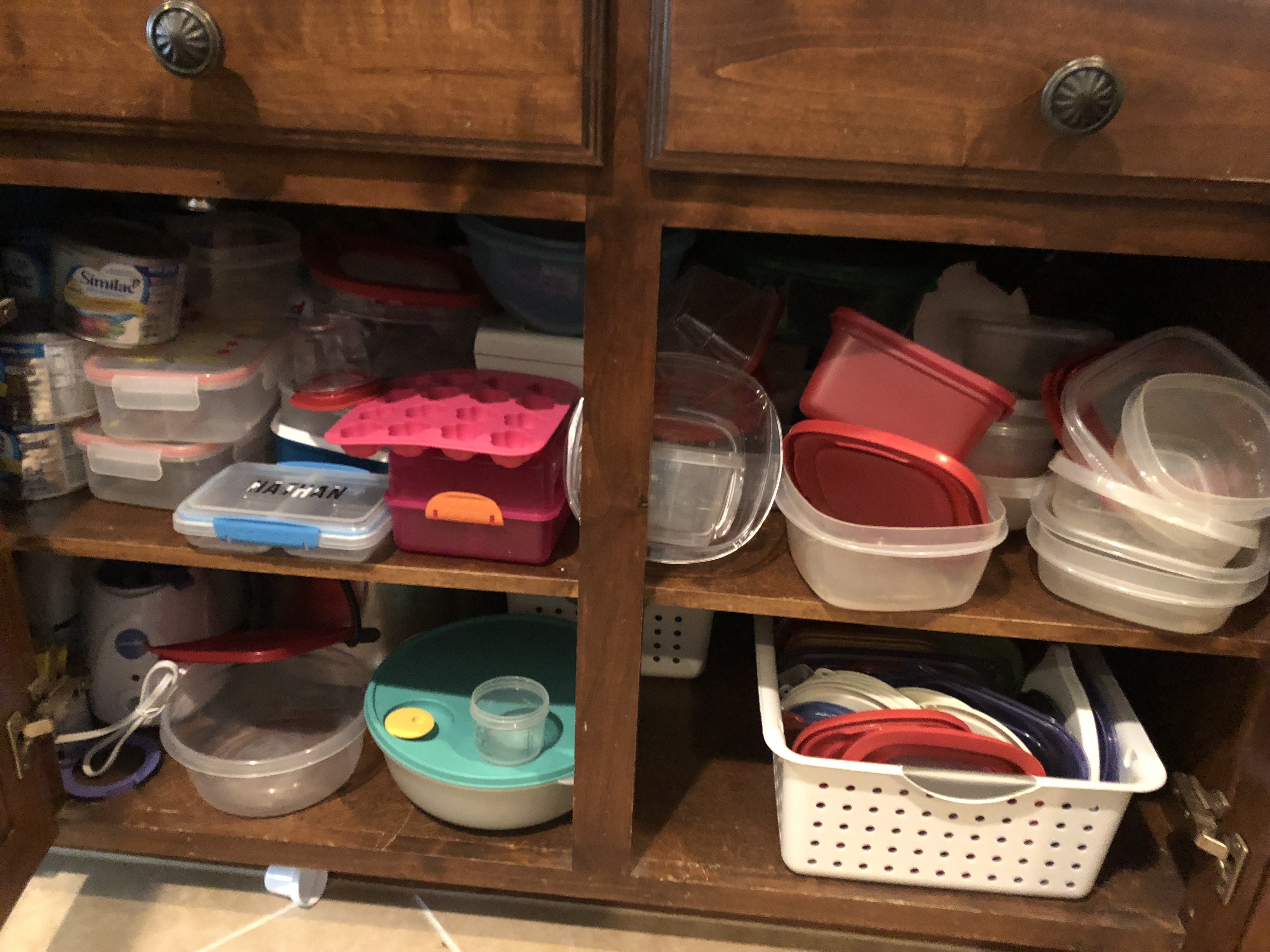 My kitchen was an area that I thought was some what functioning. Well, I actually confessed to her early on that I was soooo exhausted from the cups jumping out of the cabinets every time I opened the door…and sometimes with the door shut! We started there. I wish I would have counted…but it was SOOOO many more then I would like to admit that I was holding on it…and why? I am really not sure. We grabbed a donation box and started filling it up. There are 6 people in my family… no need for 60 cups. (There really might have been that many in there!) She helped me to move thru the large amount and make quick decisions. I was amazed how little I was really attached to many of the items and how easy it was to let them go. We moved from the cups to the plates/bowls area and that was a quick fix. After those cabinets, we moved to tupperware. I had cleaned it out a few months ago and only kept pieces that had lids…but somehow we already had mismatched extras hanging out. We got that organized, as well as the kids lunch boxes and bags.