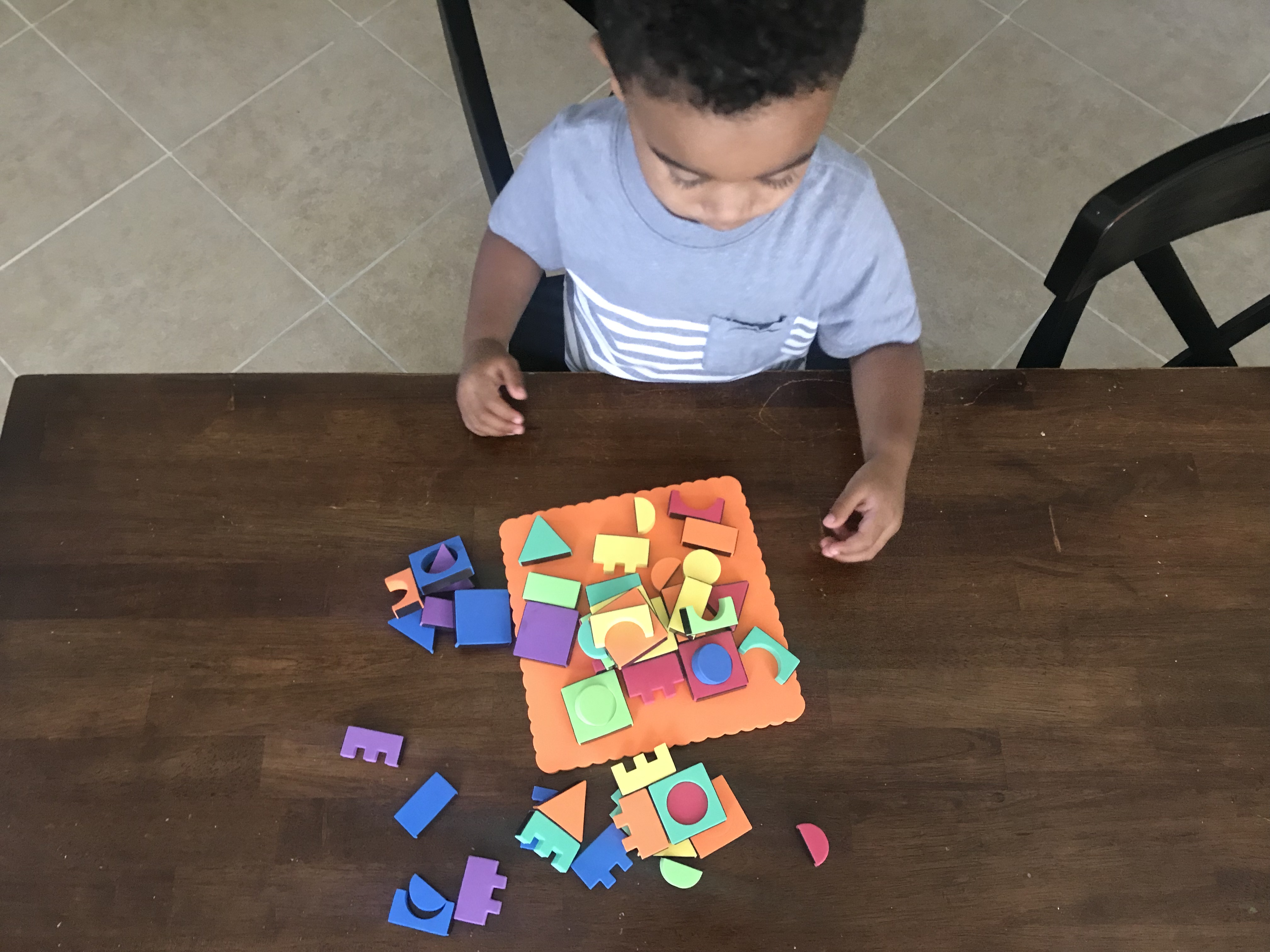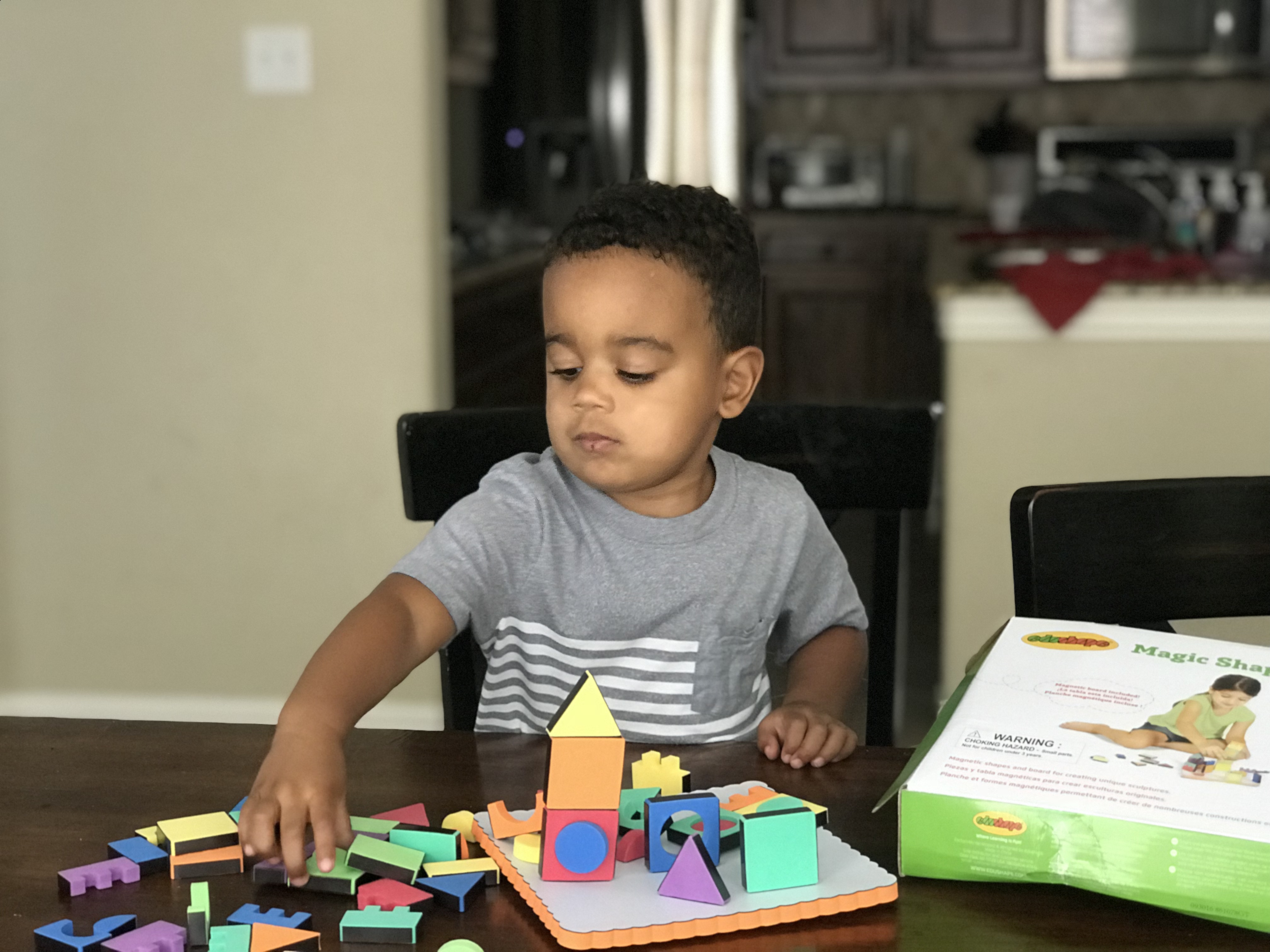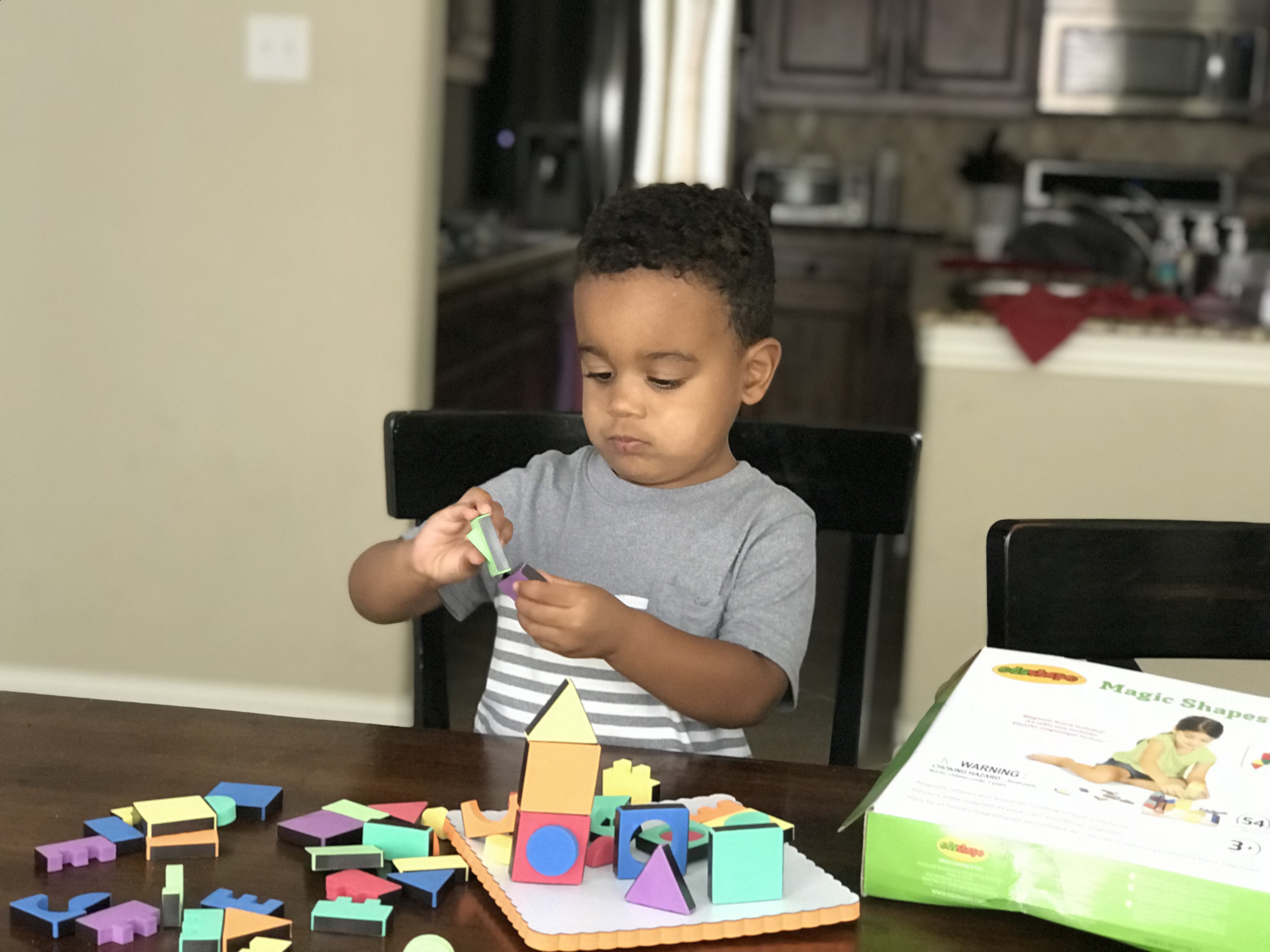 The big kids are back in school and my little guy is hurting for attention now! He misses them so much! This means mama is staying busy keeping him busy or he is begging for snacks every 10 minutes! I have been trying to find things that are hands on or things that are active that will engage his little brain to think and hands to work! I was recently sent this little EduShape Magic Shape set and Nathan loves them!