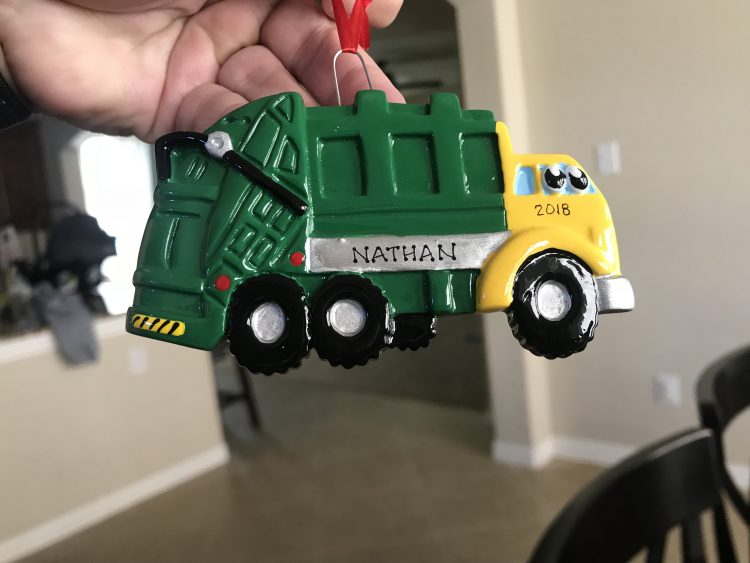 Christmas is coming quickly! In fact it’s NEXT MONTH! With Thanksgiving next week, I am starting to really my thoughts on Christmas. Each year, I try to find an ornament that represents what my kids are really into that year. It’s fairly easy for my big kids as they are are into sports, gymnastics and things that are fairly common…but my little guy… he really isn’t into things like that just yet. His big love is the garbage truck!