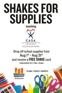PDQ is offering an awesome pay it forward opportunity as we got Back to School. Items needed: Binders Crayons Colored pencils Dry-erase markers Erasers Glue sticks and bottles Highlighters Loose-leaf paper Markers Notebooks Pencils Pencil bags Pens Rulers Tissues Two-pocket folders