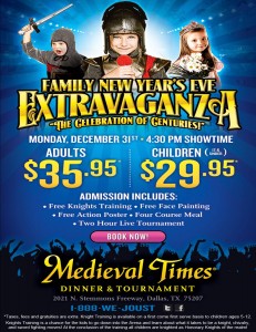 Looking for a Family Friendly way to ring in the New Year? Look not further! You can head to the DFW Medieval Times at 4:30PM on Dec. 31st to enjoy their Family New Years Eve Extravaganza! There will be: Free Knight Training Free Face Painting And a FREE Action poster for every child! Details: Adults […]